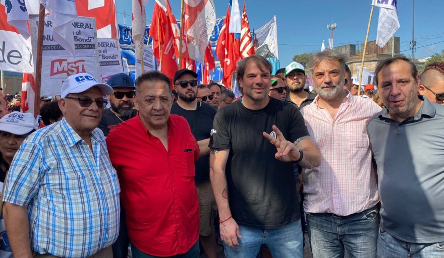 “Estamos acá con Juan Carlos Alderete, de la Corriente Clasista y Combativa, on compañeros de más de 40 organizaciones rechazando el DNU, la ley ómnibus, la ausencia del Estado en momentos tan complejos”, afirmó D'Elía en diálogo con la prensa.
