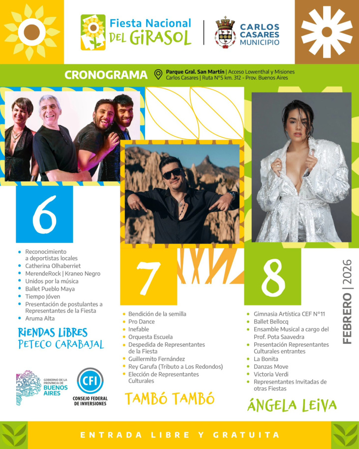 Con entrada libre y gratuita, la Fiesta Nacional del Girasol se consolida como una política cultural de acceso abierto, que apuesta a sostener las celebraciones populares como espacios de encuentro, memoria e identidad compartida.