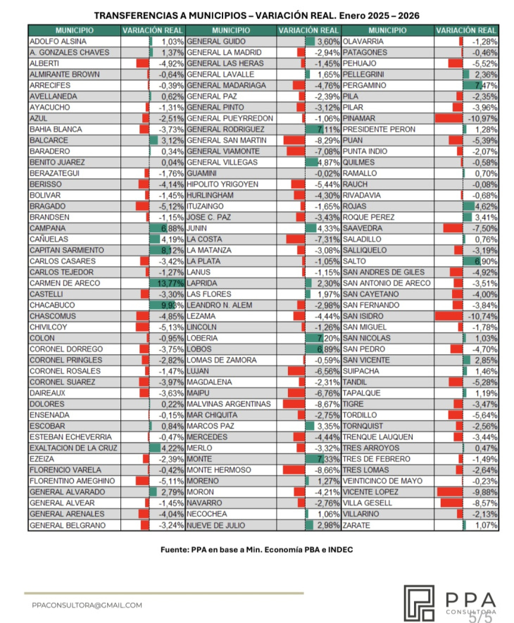 El inicio del año 2026 ha encendido las alarmas en los 135 distritos de la provincia de Buenos Aires. Según un informe detallado de la consultora PPA, las transferencias totales a los municipios durante enero sufrieron una caída real del 2,24% en comparación con el mismo mes del año anterior.