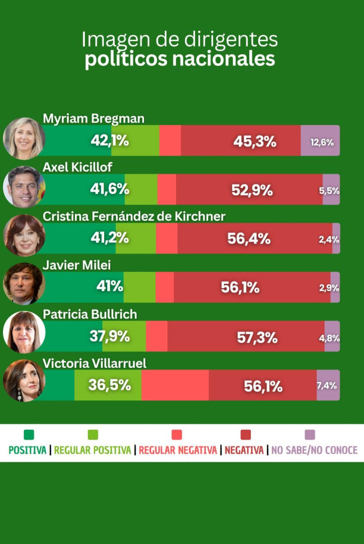 Respecto a las imágenes de los principales referentes, Kicillof (41,6%) y Cristina Kirchner (41,2%) se mantienen competitivos. En tanto, la imagen de Milei se ubica en un 41%, con una negativa que ya roza el 56%.