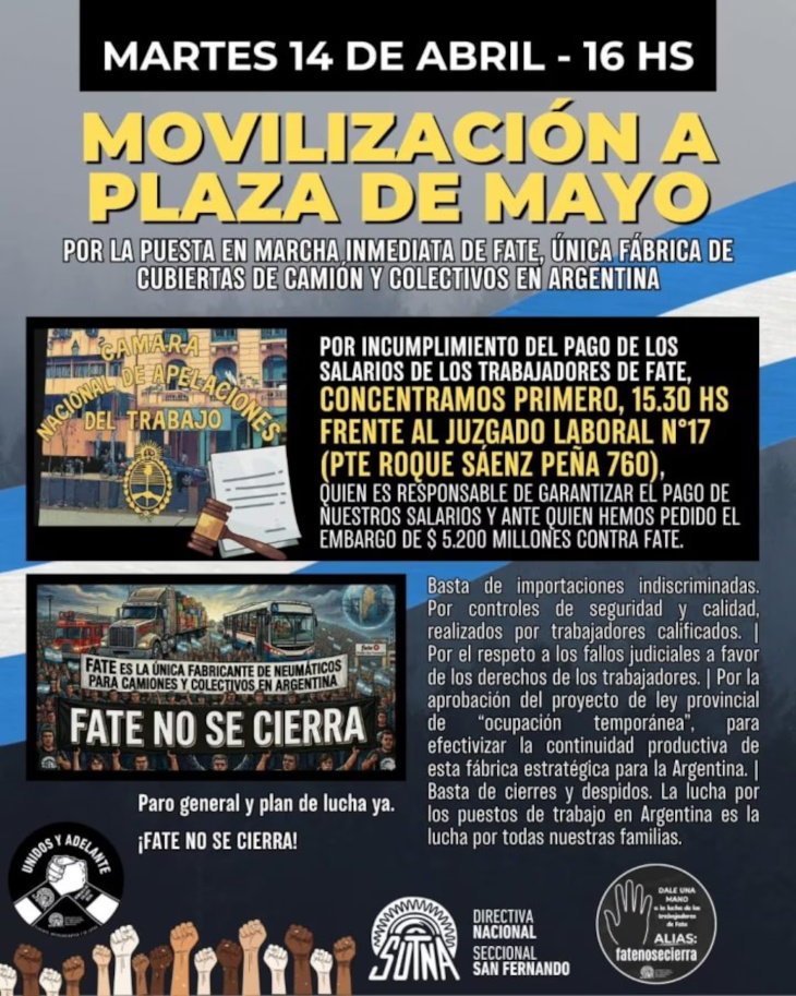 El conflicto en la planta de neumáticos FATE escala a una nueva fase de confrontación directa. Esta tarde, a las 15:30, los trabajadores despedidos y el sindicato SUTNA se movilizarán por el centro porteño para denunciar el cierre de la planta de San Fernando y exigir el pago de salarios adeudados, en medio de una parálisis productiva que ya afecta a todo el sector automotriz.
